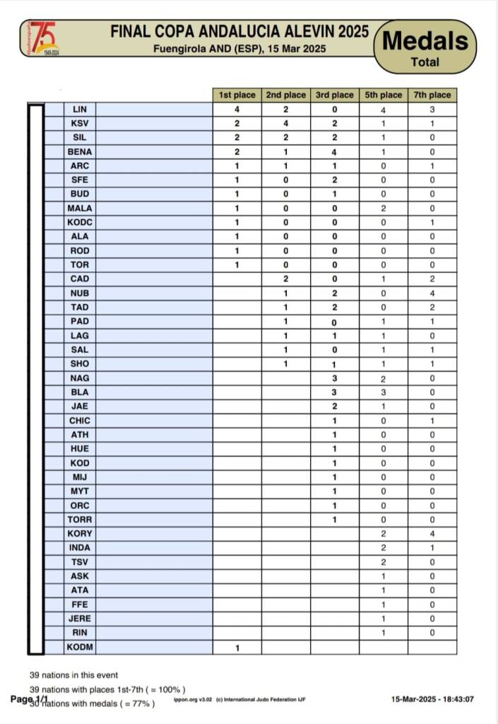 Tras conocer el medallero de la Copa de Andalucía Alevín informamos que el CD Judolin se alza hasta el primer puesto en la clasificación por clubes.